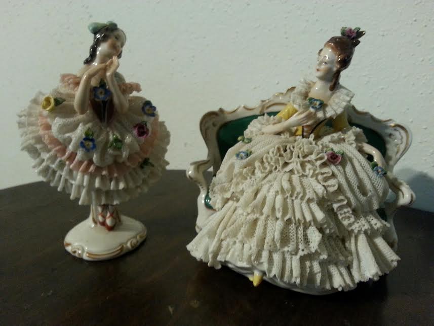 Many times I tried to tell the story behind the Dresden figurines. The ones in the glass cabinet that I stared at my whole life. My parents bought those beautiful little ballerinas, with their tutus of delicate porcelain lace, in 1947 from a German family who had to sell their precious keepsakes to feed themselves. But, how could that matter now? Surely someone will see their value and give them a good home, where they can be admired everyday as a beautiful works of art. The finely etched beaten copper table top my father brought back from Pakistan when he served there in the ’50’s. The painting of the two devilish monks my first true love, George, gave me when I was 18 years old.